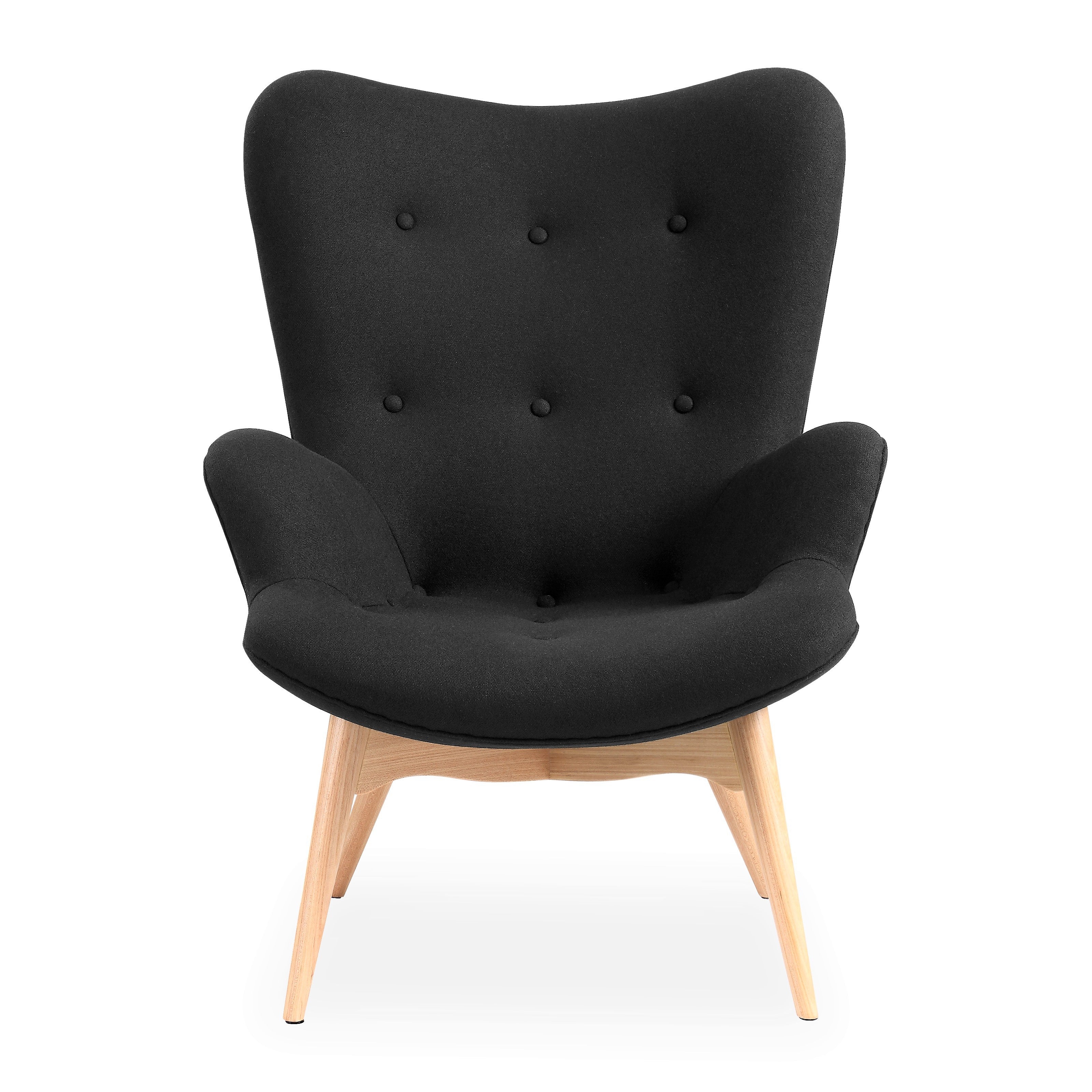 Comfortable lounge chair with fabric upholstery and light wood base providing a unique touch to the room.