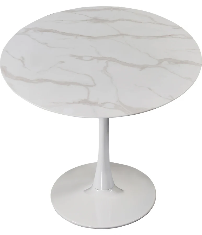 Elegant round dining table with faux marble (stone) top and white aluminum base.